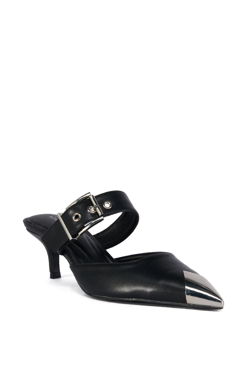 The AZALEA WANG Fairbanks Black Pump is an edgy faux leather style featuring a mule silhouette, faux silver metallic hardware, a pointed toe, a reflective metallic toe cap accent, and a slim stiletto kitten heel. Complete with a rubber outsole, a Comfort Cushion insole, and an adjustable, buckled foot strap. Pair with a fitted top and wide leg trousers for a finished look.