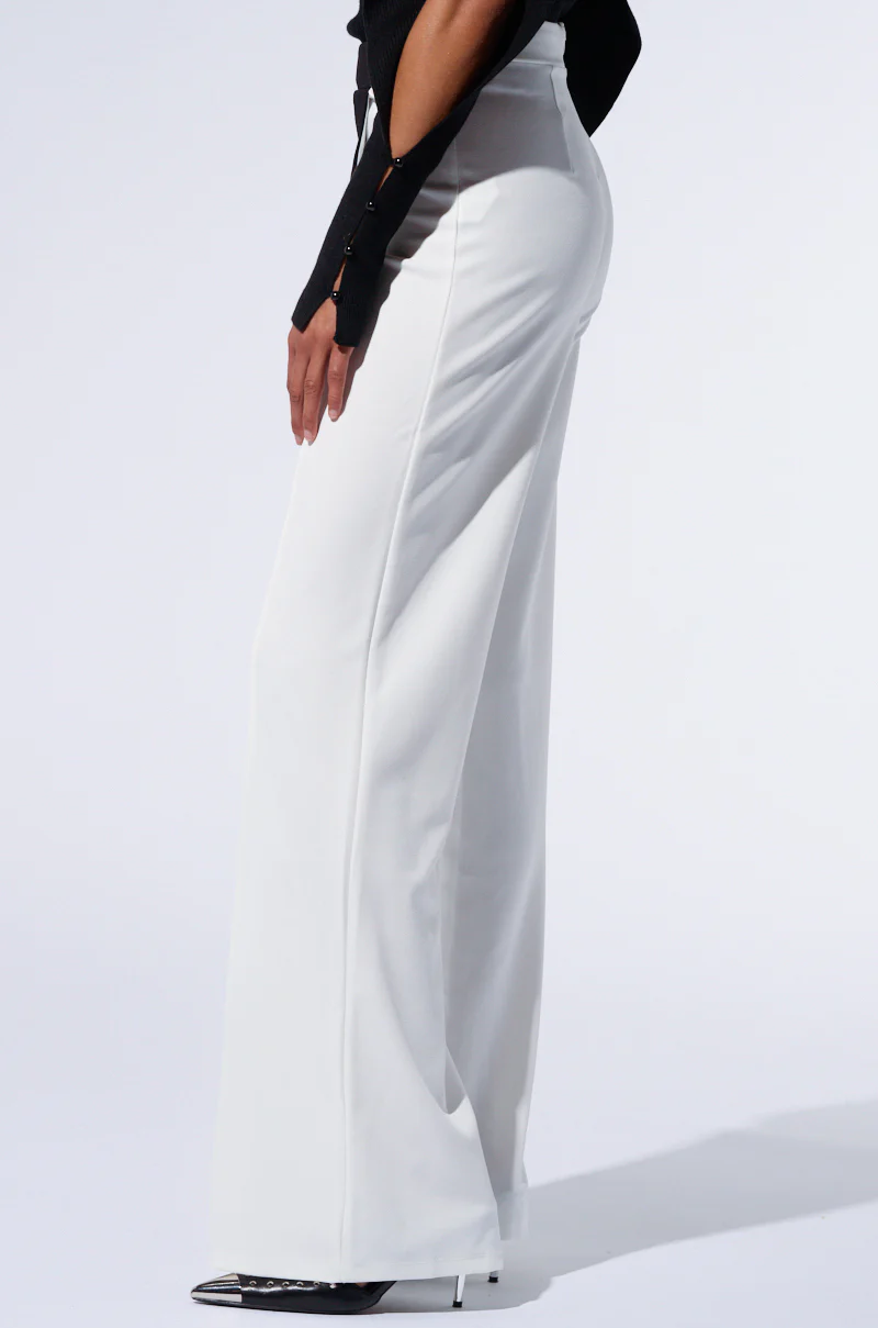 Keep your standards high, babe. The AKIRA Label Be Better Pant is crafted from a stretchy sleek knit fabrication and features a high rise design, tonal stitching, a back zipper closure, and a wide leg silhouette. Complete with a slanted fabric overlay with contrast trim that drapes across one leg for a dramatic effect. Pair with pointed pumps and a button down blouse for a spicy formal fit.