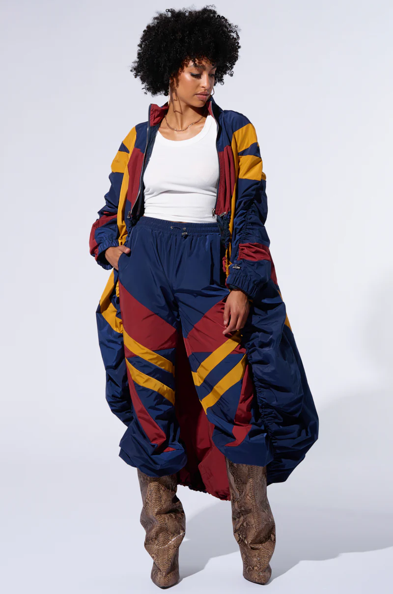 Livin’ the fast life in The AKIRA Label Born To Run Windbreaker Trench. This statement jacket is crafted from a non-stretch windbreaker fabrication and features features a color block print design, a standing collar, long ruched sleeves with interior adjustable drawcord accents, cinched cuffs, faux silver metallic hardware, contrast polyester inner lining, and a front zipper closure. Complete with a ruched high low hem with an adjustable drawcord interior, creating a large front slit for easy mobility. For an effortless look, pair with the coordinating AKIRA Label Born To Run Windbreaker Joggers.