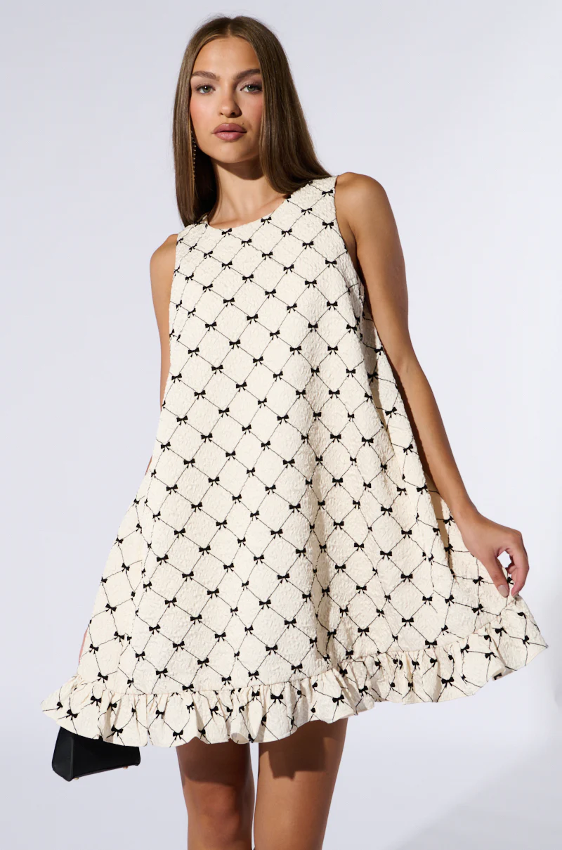 Girly girls, rise up. The AKIRA Label Covered In Bows Mini Dress is a sugary sweet shift dress featuring a mini-length, sleeveless silhouette with seersucker detailing throughout. It boasts a romantic, ruffled hem, a pearly button down back closure, and all-over petite velvet bow embroidery. Style it with a pair of mary janes and a beret to slay the coquette trend.