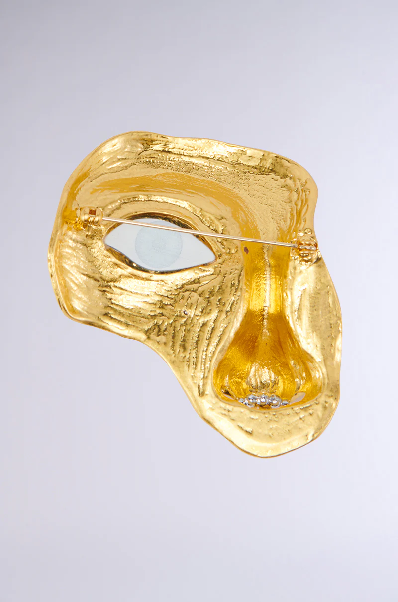 Your face card stays winning with The AKIRA Label Face Off Brooch. This unique statement piece is crafted from a faux metallic gold base and features an artsy cut out of a face profile including a nose and eye embellishment, with a variety of silver metallic face piercing detailing. Complete with an easy safety pin-style fastening. Add to any outfit to elevate your ensemble.