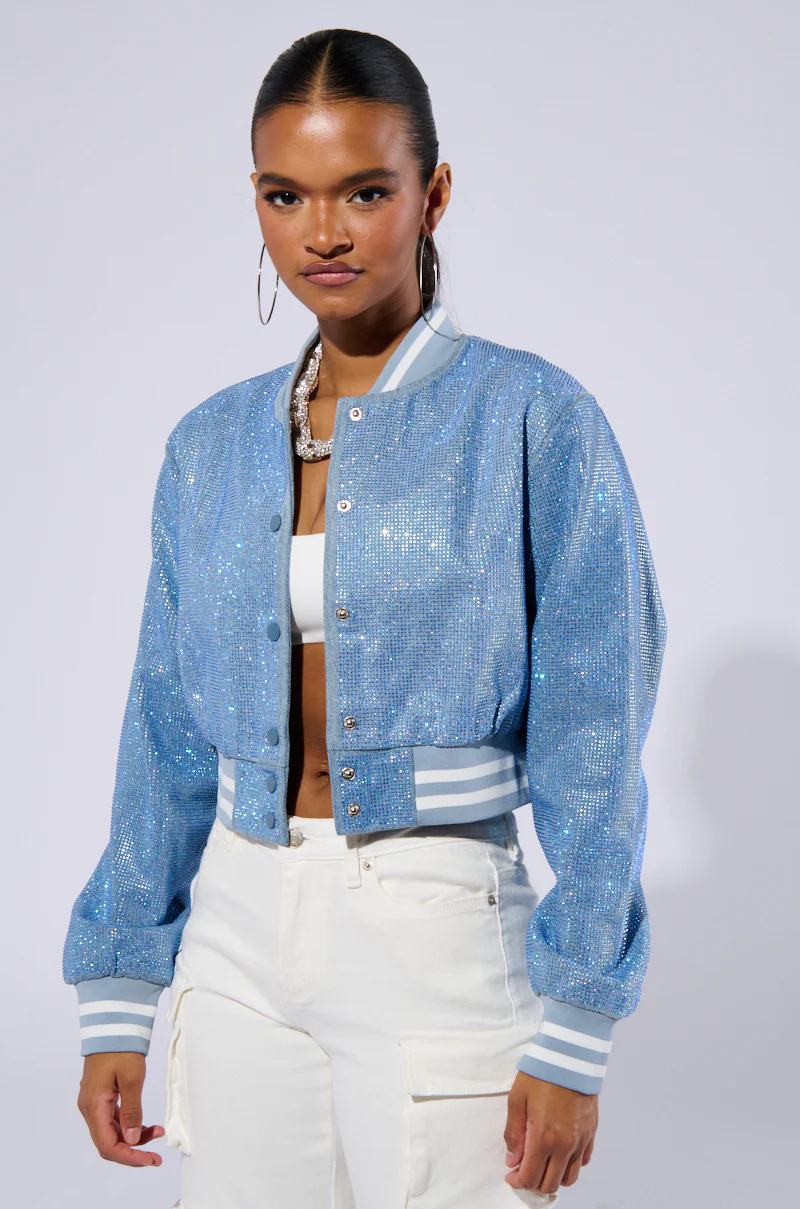 ALERT! The denim jacket of your dreams just dropped… The AKIRA Label Harley Embellished Denim Bomber is crafted from supple denim in a classic blue wash and features a slick inner lining, a cropped, classic bomber silhouette, dual-tone, varsity-inspired stripe detailing at the collar, sleeve cuffs, and hemline, and a tonal snap button front closure. Petite, tonal rhinestone detailing throughout adds feminine flair for a fabulous, flashy finish.