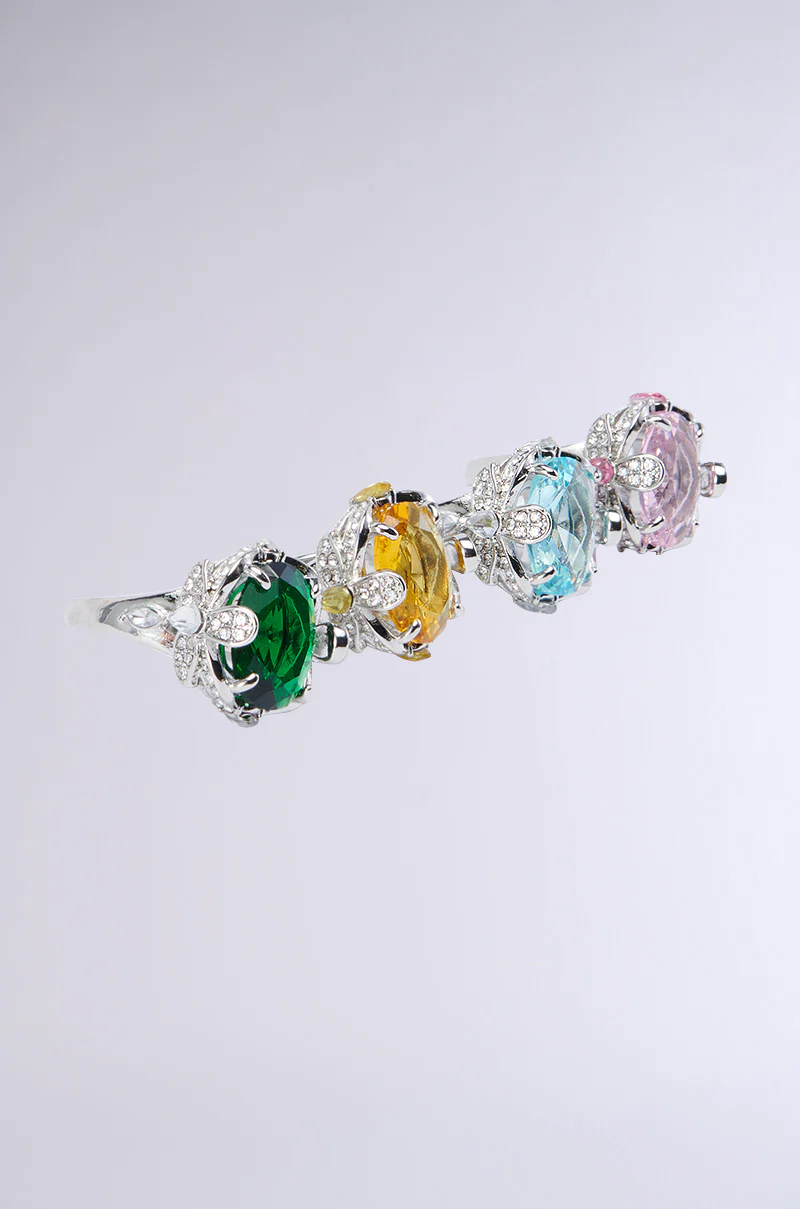 Mamma Mia! You need The AKIRA Label Italian Love Ring Set. This zany jewelry set features three rings crafted from metallic faux gold. Two of the rings feature an ovular, starburst-inspired silhouette encrusted with petite silver rhinestones and large colored jewels, while the third ring features a wider, chunky band adorned with zebra-inspired stripes and silver rhinestones. Pair them with any outfit for added flair and fun!