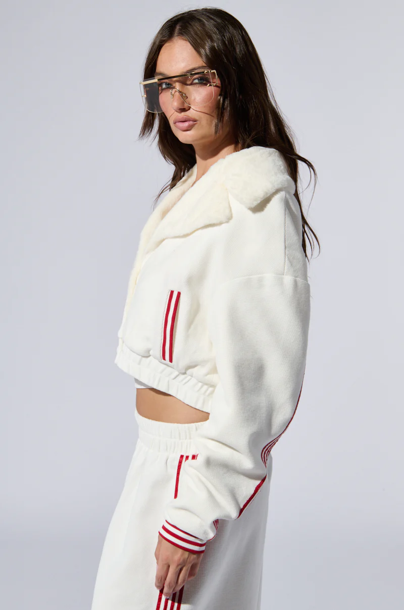 Live your Sporty Spice fantasy in The AKIRA Label Lula Waffle Knit Bomber. This cropped cutie is crafted from a soft, semi-stretchy waffle knit fabrication and boasts an impossibly plush faux fur lining, a plunging neckline with a wide, notch-lapel collar, long sleeves with red, varsity-inspired stripes, coordinating ribbed knit cuffs, and an elasticized hem. It’s complete with a tonal, triple-button front closure and two waist pockets with striped accents. Wear it with the matching Lula Waffle Knit Pants and chunky sneakers for a coordinated look from head to toe.